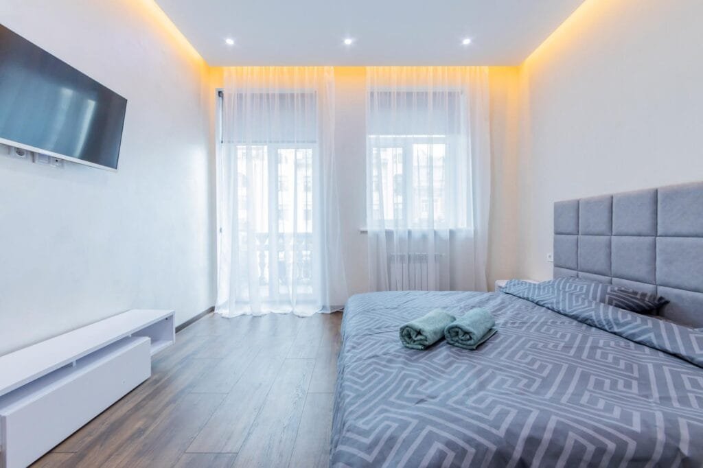 Світла простора кімната з двоспальним ліжком, двома тумбами, великою шафою для речей, телевізором і панорамним вікном майже на всю стіну.