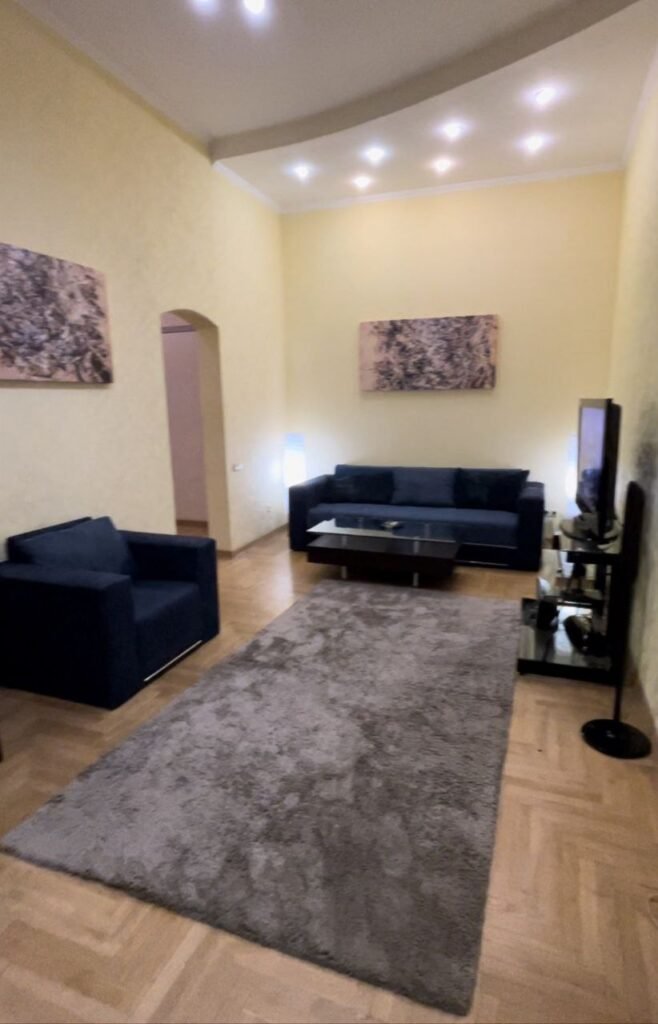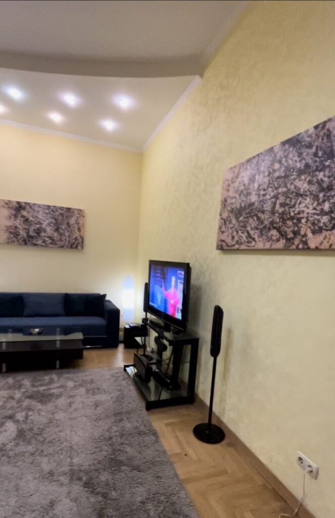 Квартира розташована за адресою вул. Євгена Чикаленка, 21, поблизу ст. м. Театральна. У пішій доступності знаходяться ресторани, кафе, кав’ярні, банк та різноманітні магазини. Простора світла вітальня вміщує все для комфортного дозвілля. А саме: великий диван, крісло, журнальний столик та комод з телевізором.