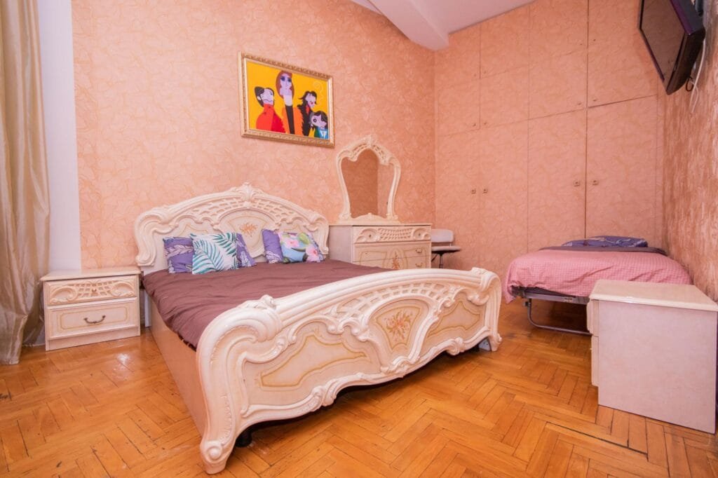 Пастельно-персикова спальня з двоспальним ліжком з ортопедичним матрацом, телевізором, тумбочками, журнальним і туалетним столиками, великою шафою для речей.