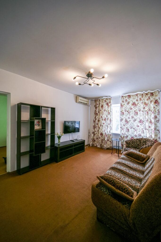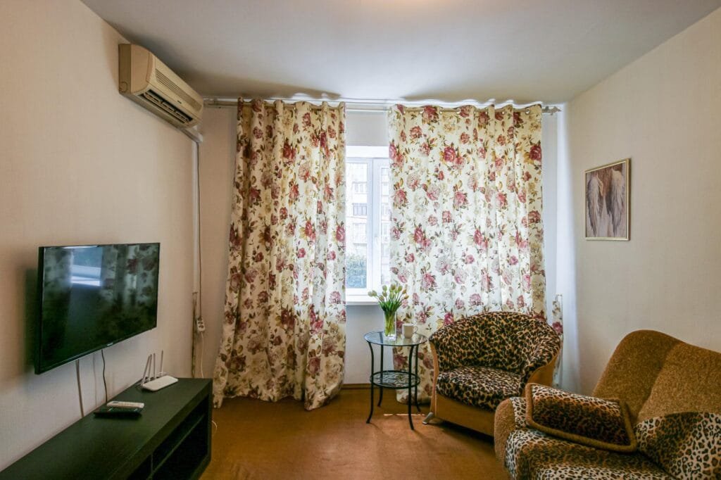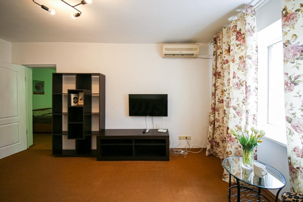 Є розкладний диван, крісло, журнальний столик, телевізор, кондиціонер і шафа з полицями — ідеальне місце для відпочинку чи перегляду фільмів.