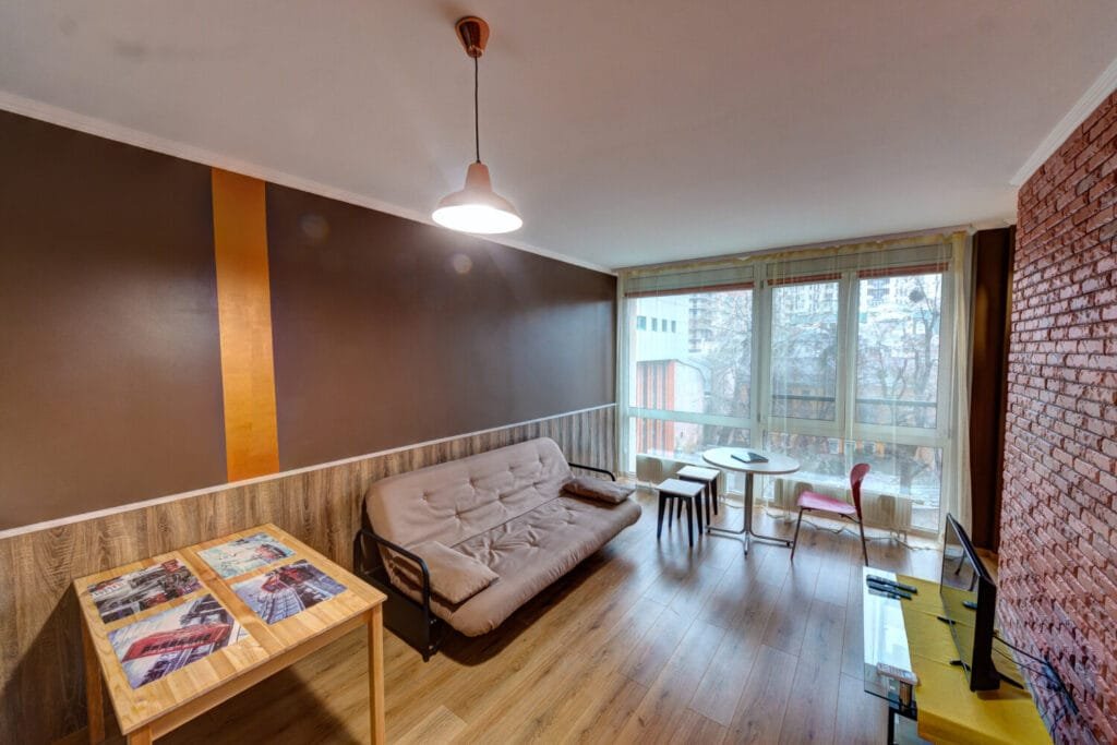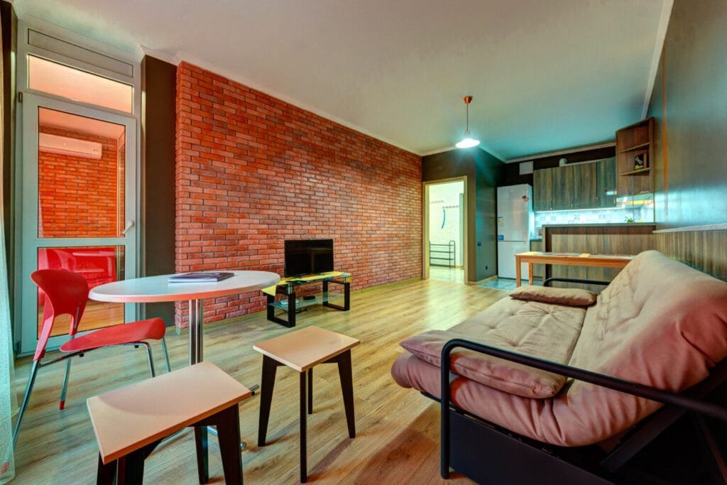 У вітальні-студії яскравим стилістичним рішенням є акцентна червона цегляна стіна. Не дивлячись на переважання деревних відтінків в інтер’єрі всередині дуже світло, завдяки панорамним вікнам, з яких відкривається чудовий краєвид на місто. У зоні вітальні знаходиться все необхідне: двомісний диван, обідній стіл зі стільцями та журнальний столик з телевізором. Крім того, з вітальнею розташований вихід на затишну лоджію на якій можна відпочити в м’якому кріслі.