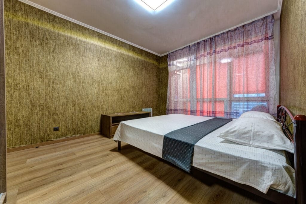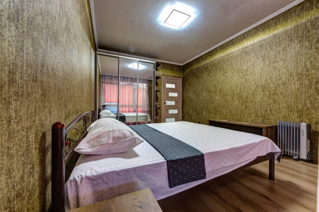 Спальня оформлена у стилістиці всіх квартир у деревних тонах. Усередині простір організований таким чином, щоб нічого не заважало вашому релакс. Всі необхідні меблі, для комфортного відпочинку надані: велике двоспальне ліжко з ортопедичним матрацом, дзеркальна шафа-купе, комод та тумбочка. У квартирі наданий кондиціонер та WI-FI для вашого комфортного проживання.