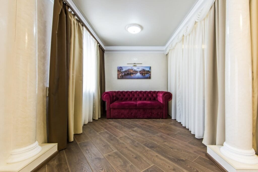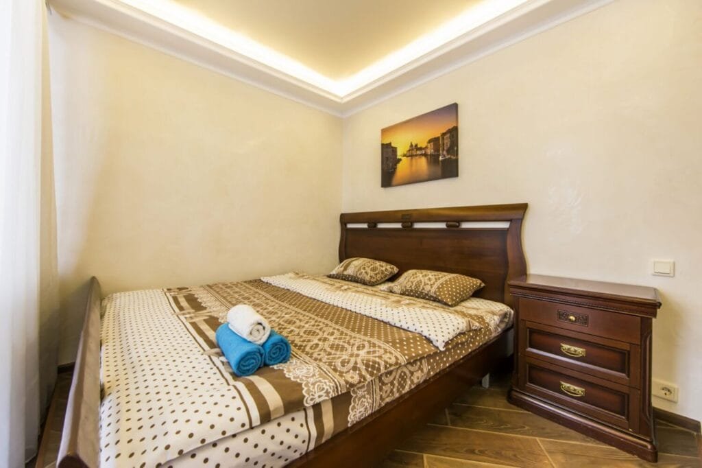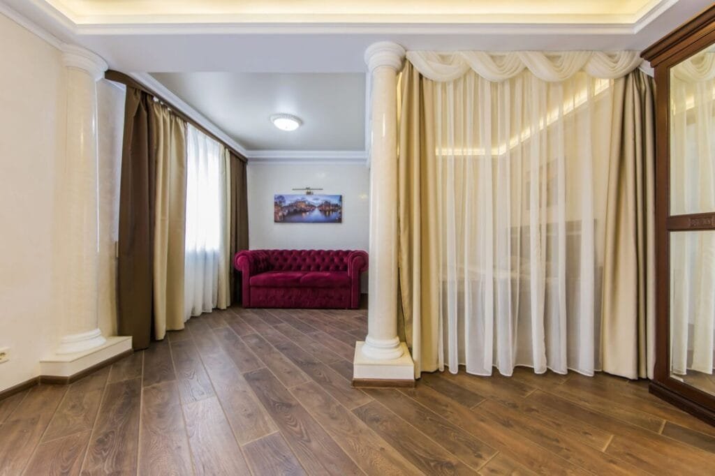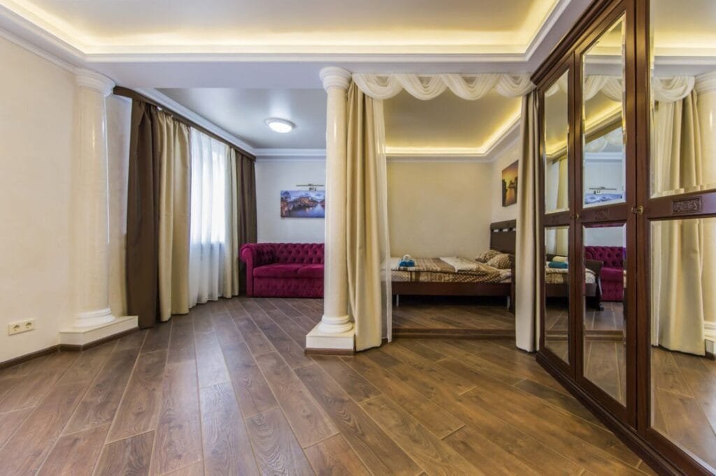 У вітальні – великий диван, місткий комод для особистих речей та телевізор. Зона спальні відокремлена шторами та колоною, тут є все необхідне для відпочинку: двоспальне ліжко з ортопедичним матрацом і приліжкові тумбочки.