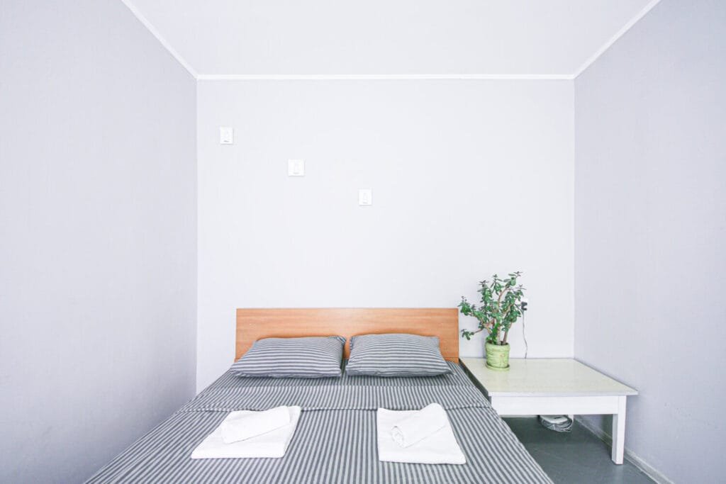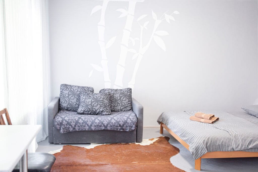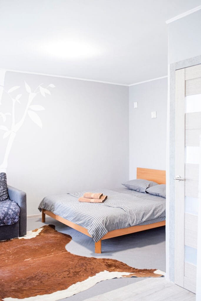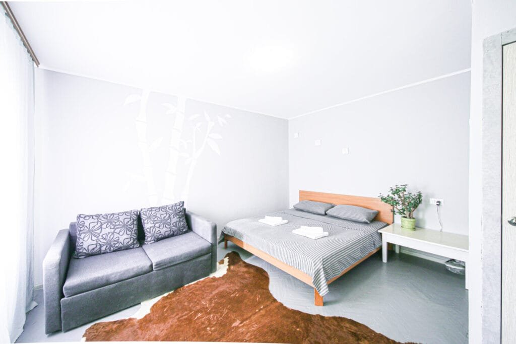 У зоні спальні розташоване двоспальне ліжко з ортопедичним матрацом і невеликий столик. У зоні відпочинку — акуратний диван (розкладний), кілька м’яких стільців, обідній стіл зі стільцями, а для приємного дозвілля встановлено телевізор. Усередині квартири світло та затишно, простір поділений на кухню, спальню та зону відпочинку.