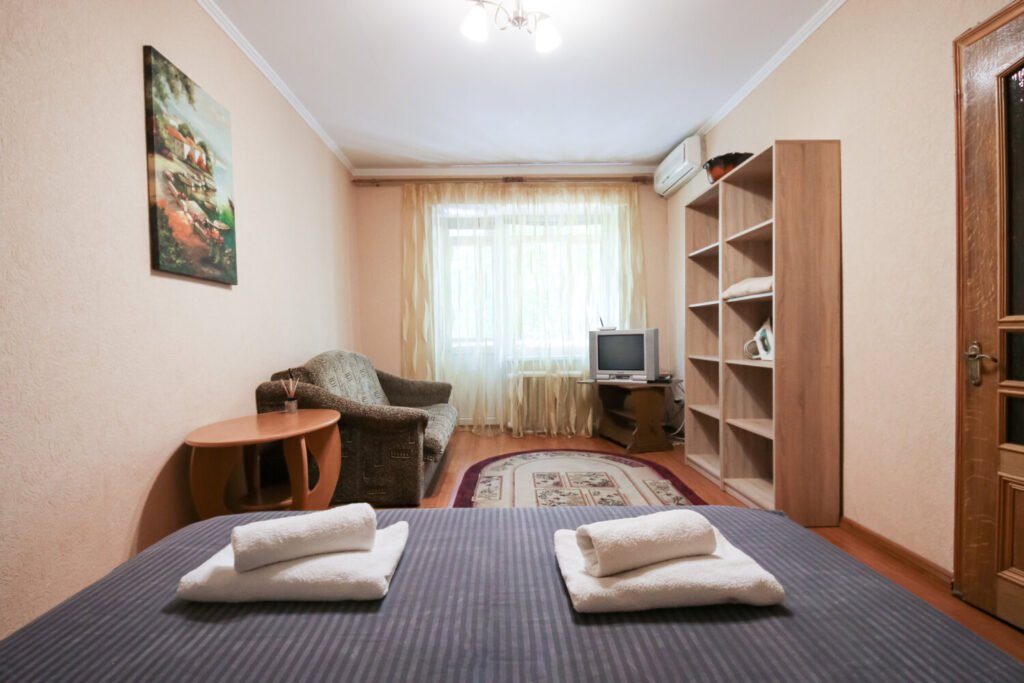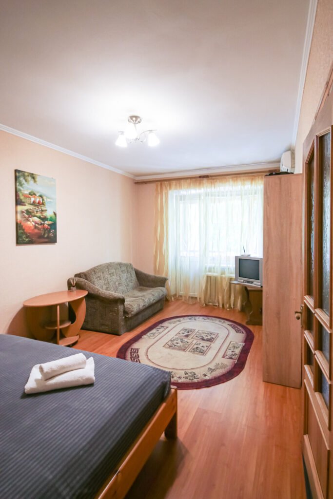 Однокімнатна квартира розміщена за адресою: вул. Госпітальна, 2, поблизу станції метро Палац Спорту. Метро розташоване за 8 хвилин ходьби (600 м). У пішому доступі розташовані: ресторани, бари, кав’ярні та супермаркет «АТБ».
