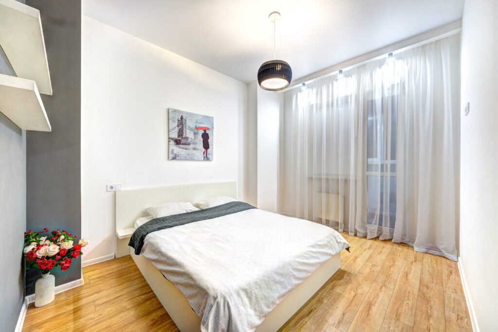 Для комфортного відпочинку спальня виконана у мінімалістичному стилі в світлих тонах.