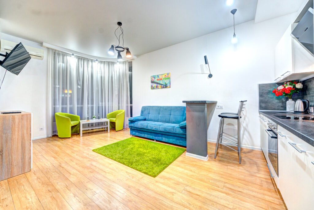 У вітальні-студії розміщено все необхідне для затишного відпочинку: бірюзовий диван, який легко перетворюється на тахту та може слугувати додатковим двоспальним місцем, зелені крісла з невеликим килимом у єдиному стилі, журнальний столик і комод.