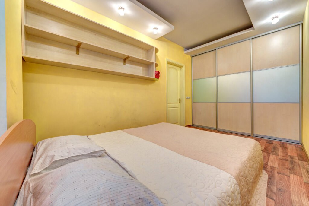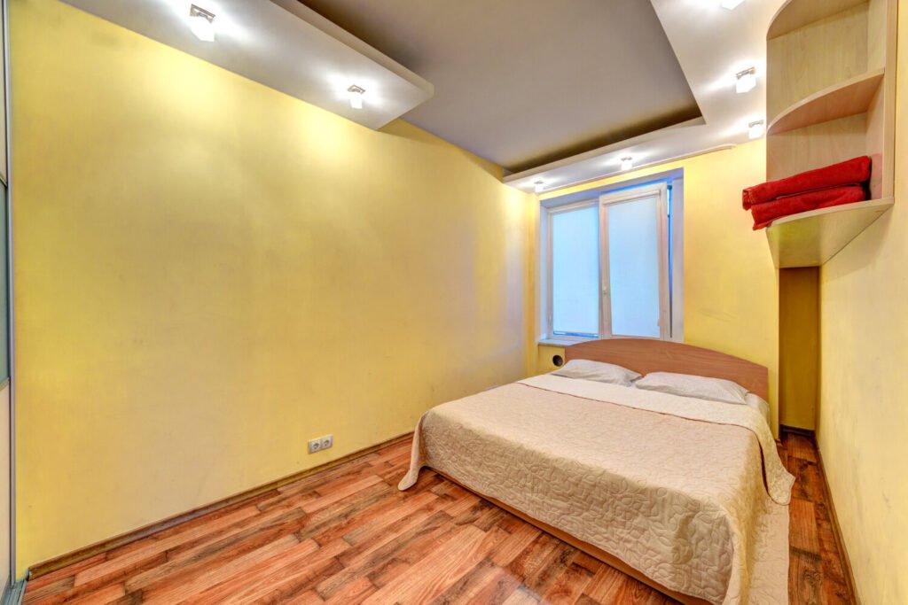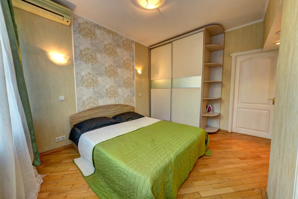 Перша спальня кольору слонової кістки з великими вікнами має двоспальне ліжко з ортопедичним матрацом, двостулкова шафа-купе. Крім того, у першій спальні є вихід на лоджію. Друга спальня виконана у жовтому кольорі приємного відтінку. Всередині двоспальне ліжко та містка шафа купе. У квартирі встановлений WI-FI та кондиціонер для вашого комфортного відпочинку.