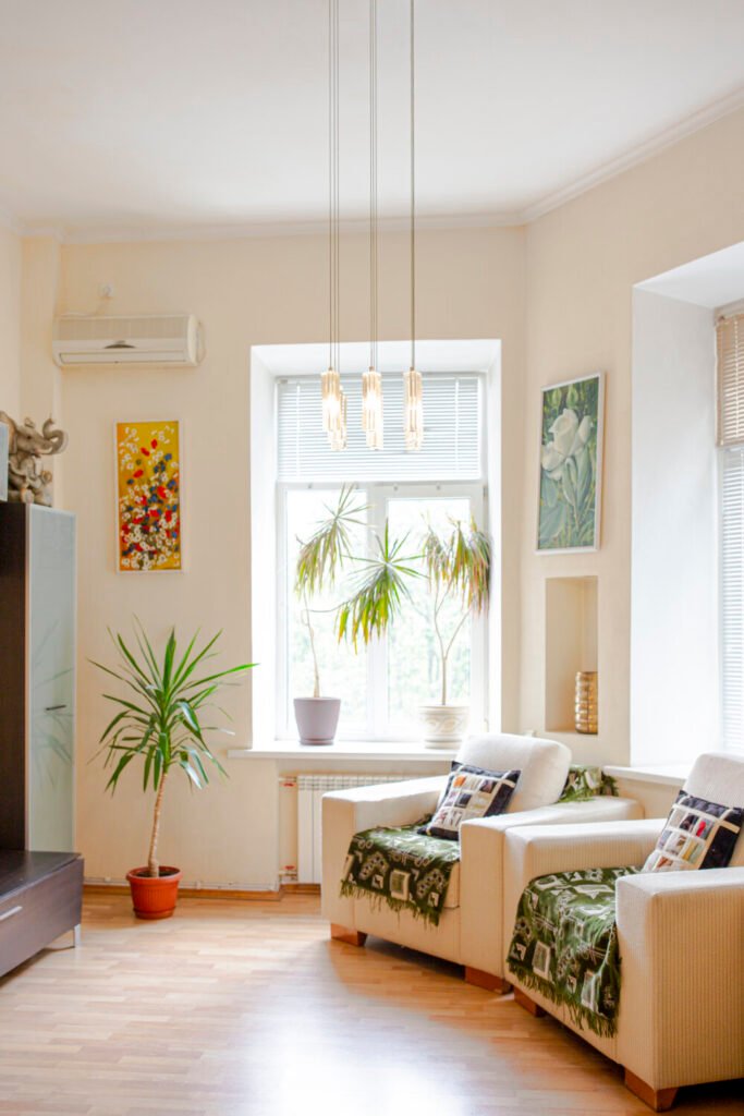 Вітальня простора з великими вікнами, виконана в кремовому відтінку. Усередині розташовані всі необхідні меблі та техніка для комфортного проведення дозвілля. А саме: меблева стінка в темному дереві, диван (розкладний) та 2 крісла в єдиній стилістиці, а також телевізор та кондиціонер. Вітальня з кухнею поєднуються аркою.