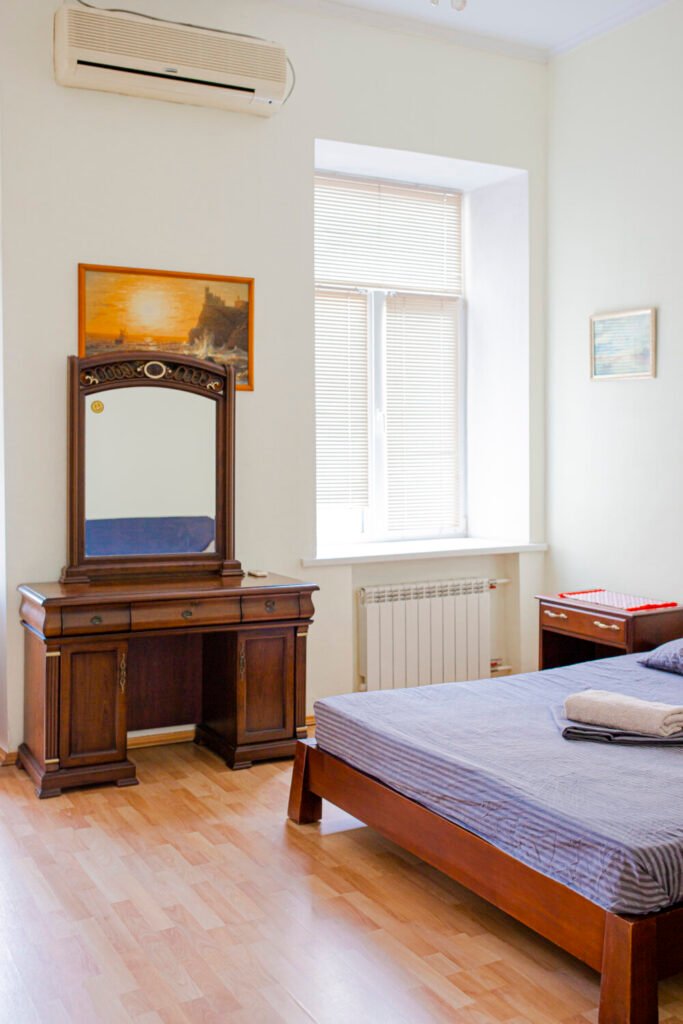 Перша спальня оформлена у світлих кольорах, який дуже освіжає. Усередині розташовані всі необхідні меблі для приємного відпочинку: ліжко двоспальне з ортопедичним матрацом, тумбочки, велика шафа з дзеркалами і туалетний столик.