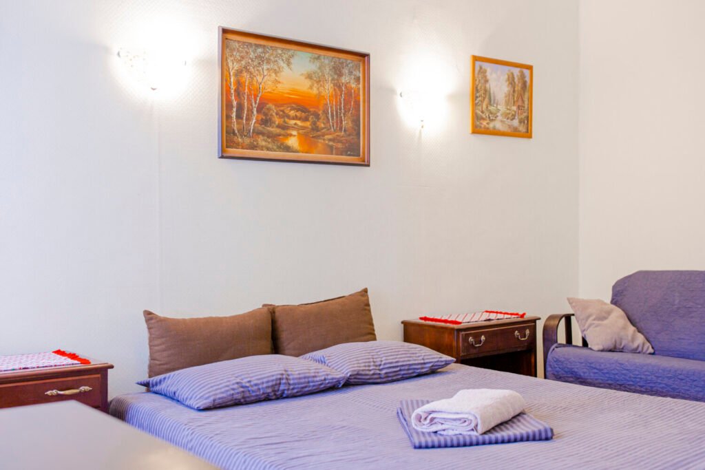Друга спальня теж оформлена у світлих відтінках. Є всі необхідні меблі для затишного відпочинку: двоспальне ліжко з комфортним матрацом, м’яке крісло для дозвілля, і ще одне крісло яке розкладається.