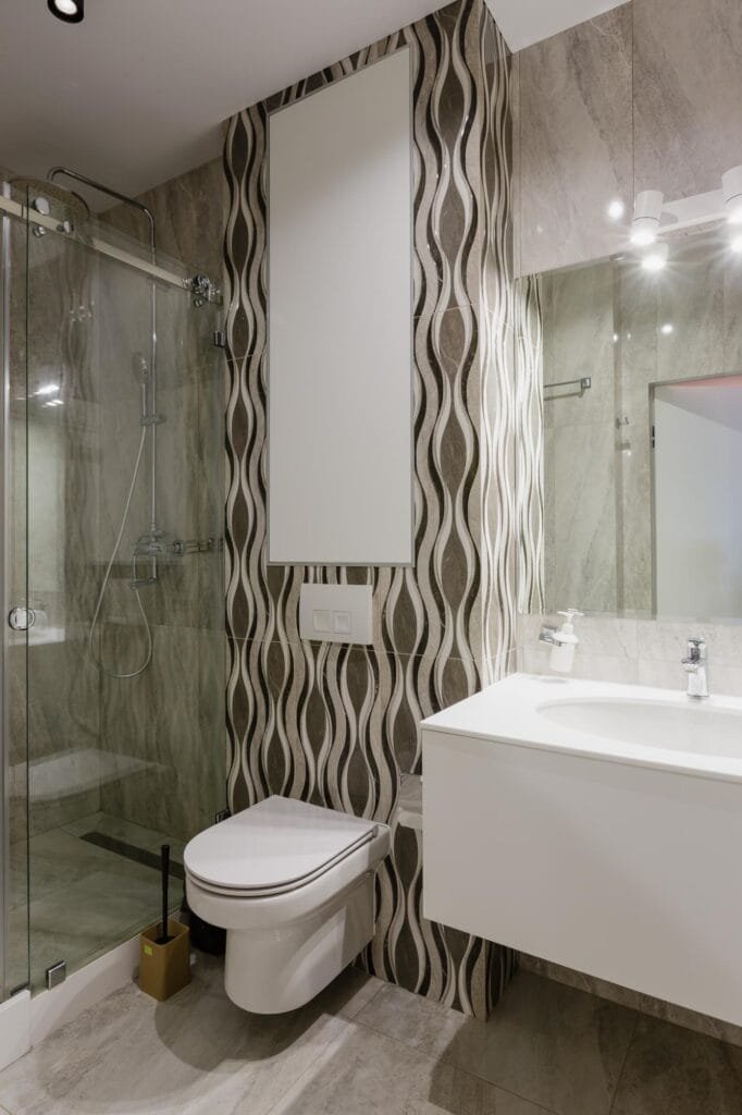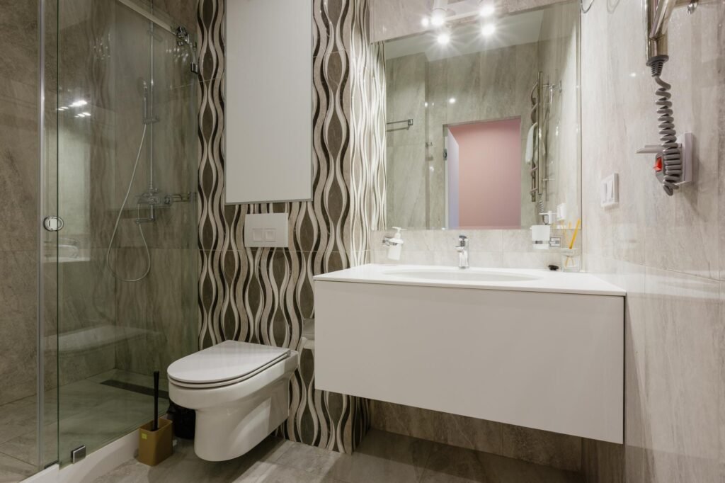 Санвузол поєднаний із душовою кабіною, пральною машиною, феном, умивальником і дзеркалом.