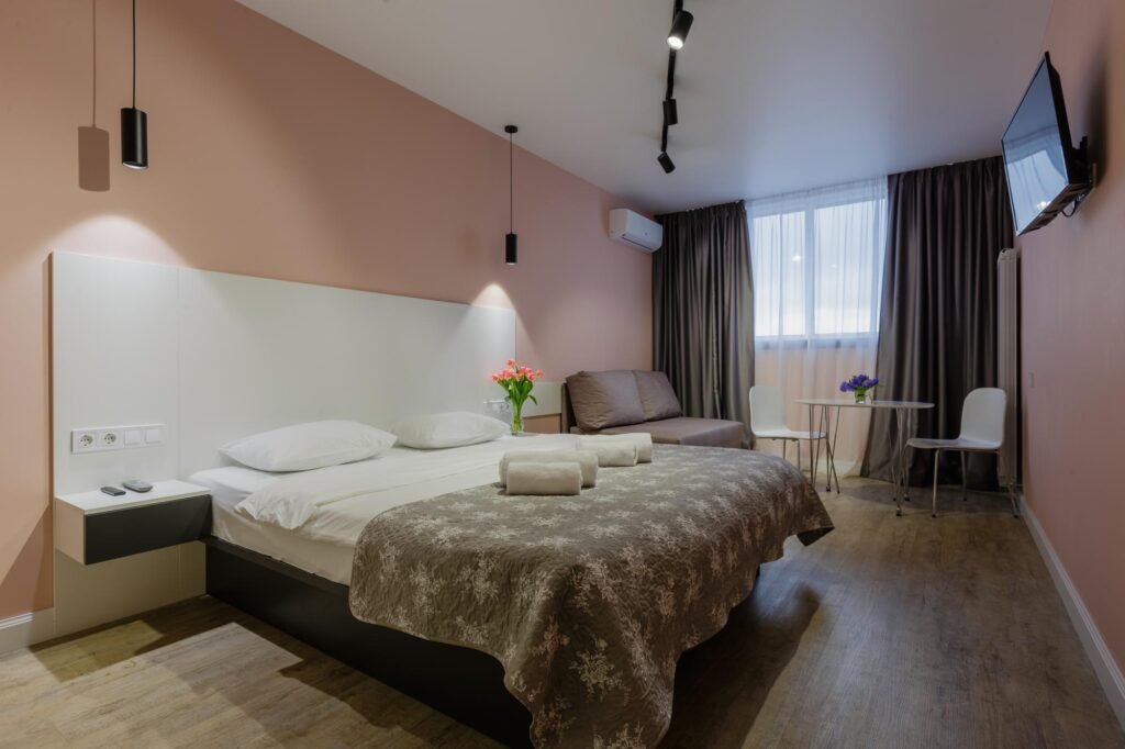 У зоні відпочинку — двоспальне ліжко з ортопедичним матрацом, розкладний диван, тумбочки, телевізор, кондиціонер і Wi-Fi.