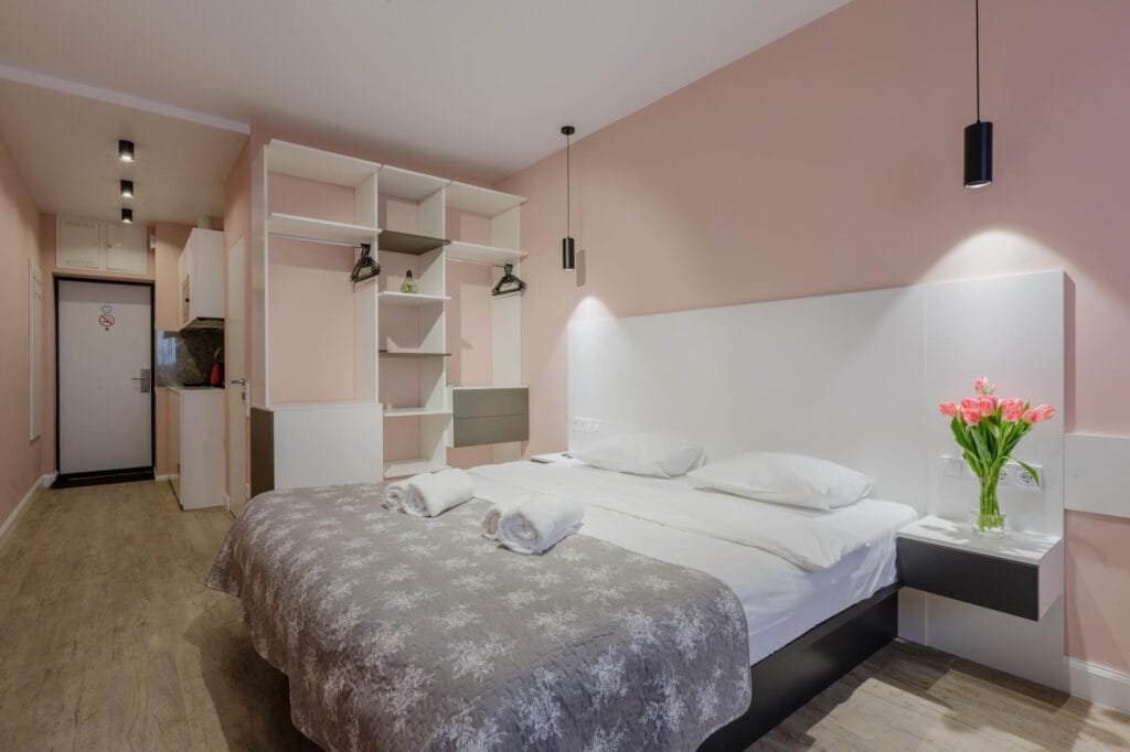 Квартира світла, з євроремонтом, оформлена у білих і персикових відтінках.